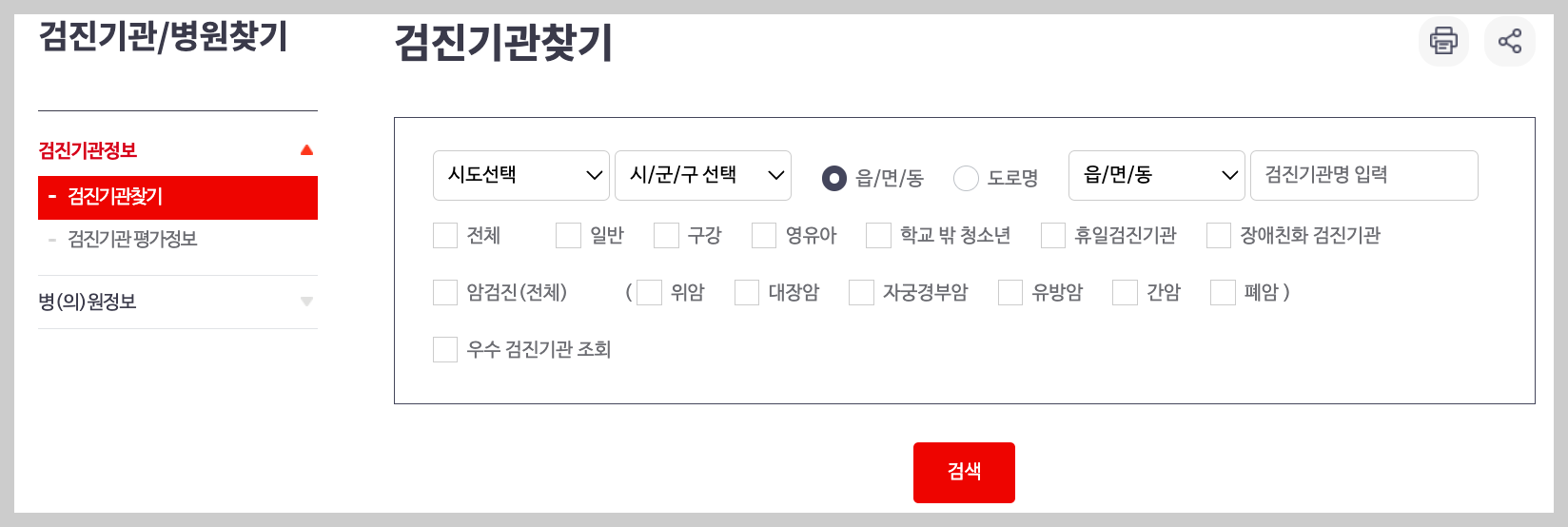 그렇다면 검진 기관은 어디에서 확인할 수 있을까요? 가급적 본인이 거주하는 지역의 가까운 병원이 좋겠죠? 마찬가지로 국민건강보험 사이트에 접속해서 검진기관을 찾아보세요. 본인이 원하는 지역을 선택만하면 모든 병원을 한 눈에 확인할 수 있어요.