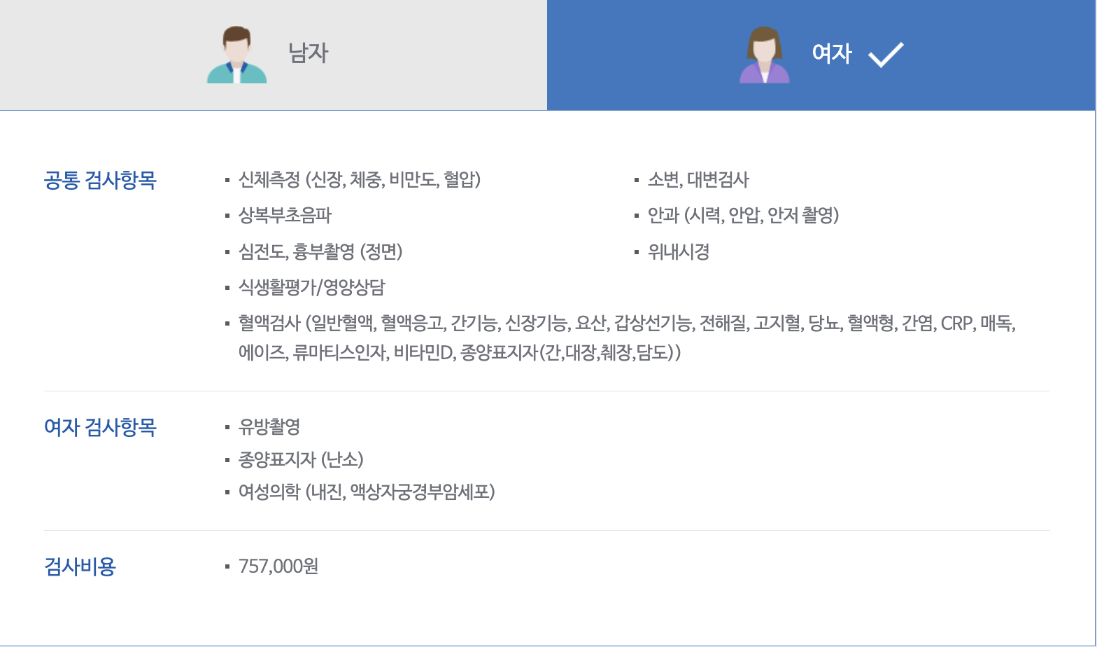 그렇다고 해서 삼성서울병원의 기본 건강 검진비용은 성인 남자기준으로 707,000원부터 시작합니다. 여자는 757,000원으로 여자 검사 비용이 조금 비싼 편입니다.