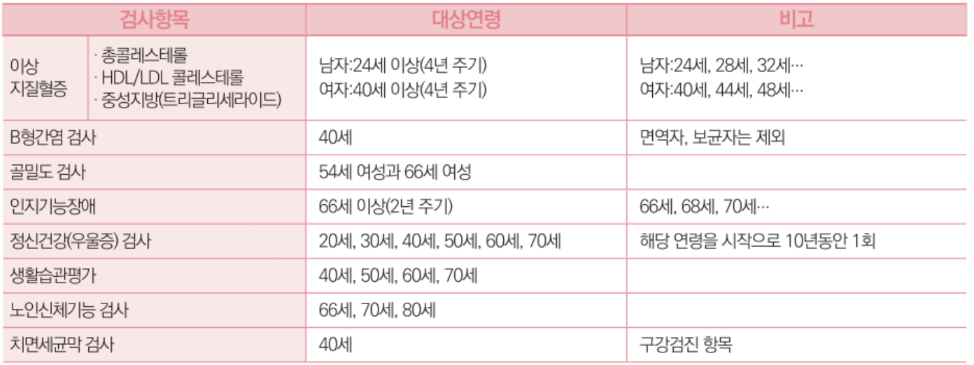 이상 지질혈증 검사의 경우 남자는 24세부터 4년 주기로, 여자는 40세부터 4년 주기로 받아야 합니다. B형 간염검사는 40세 이상부터 받을 수 있습니다. 하지만 가족 중에 관련 질병 이력이 있다면 40세 이전부터 검진을 받아보면 좋겠죠?