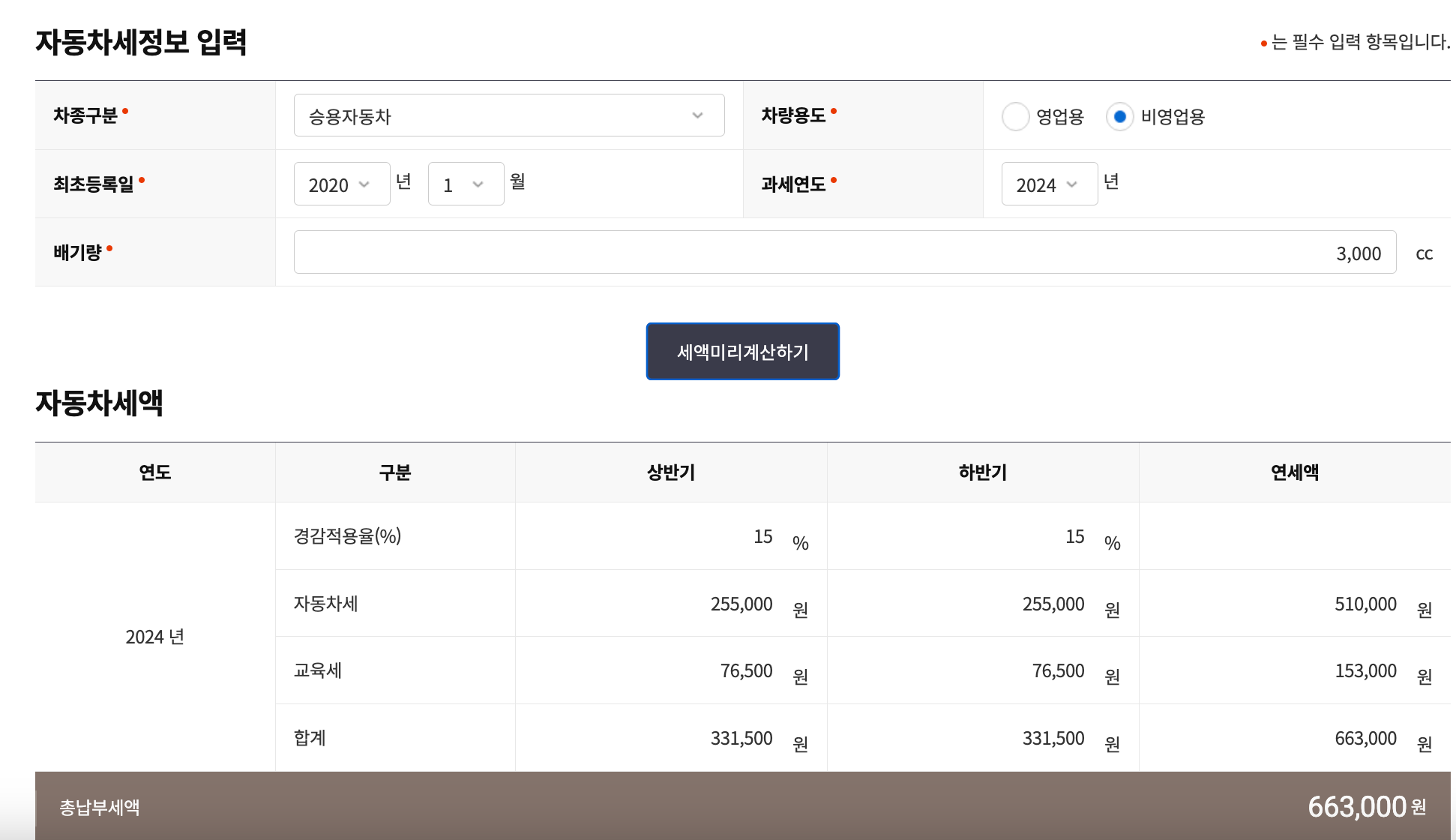 저는 예를 들기 위해 2020년 1월 등록, 3000cc 배기량을 기준으로 계산해 보았는데 663,000원이 계산되었습니다. 이렇듯 자동차세는 배기량과 가장 밀접하 관련이 있으며 차량 가격과는 무난합니다.