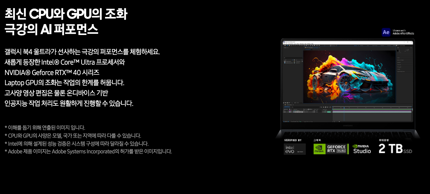 프로세서는 Intel Core Ultra9 185H, 그래픽은 GeForce RTX 4070로 윈도 노트북에 탑재되는 프로세서 중에서는 가장 높은 등급입니다. 전작인 갤럭시북 3 울트라보다 업그레이드되었습니다. 게임은 물론 영상 편집, 포토샵 사진 보정작업 등 모든 작업이 가능하죠.