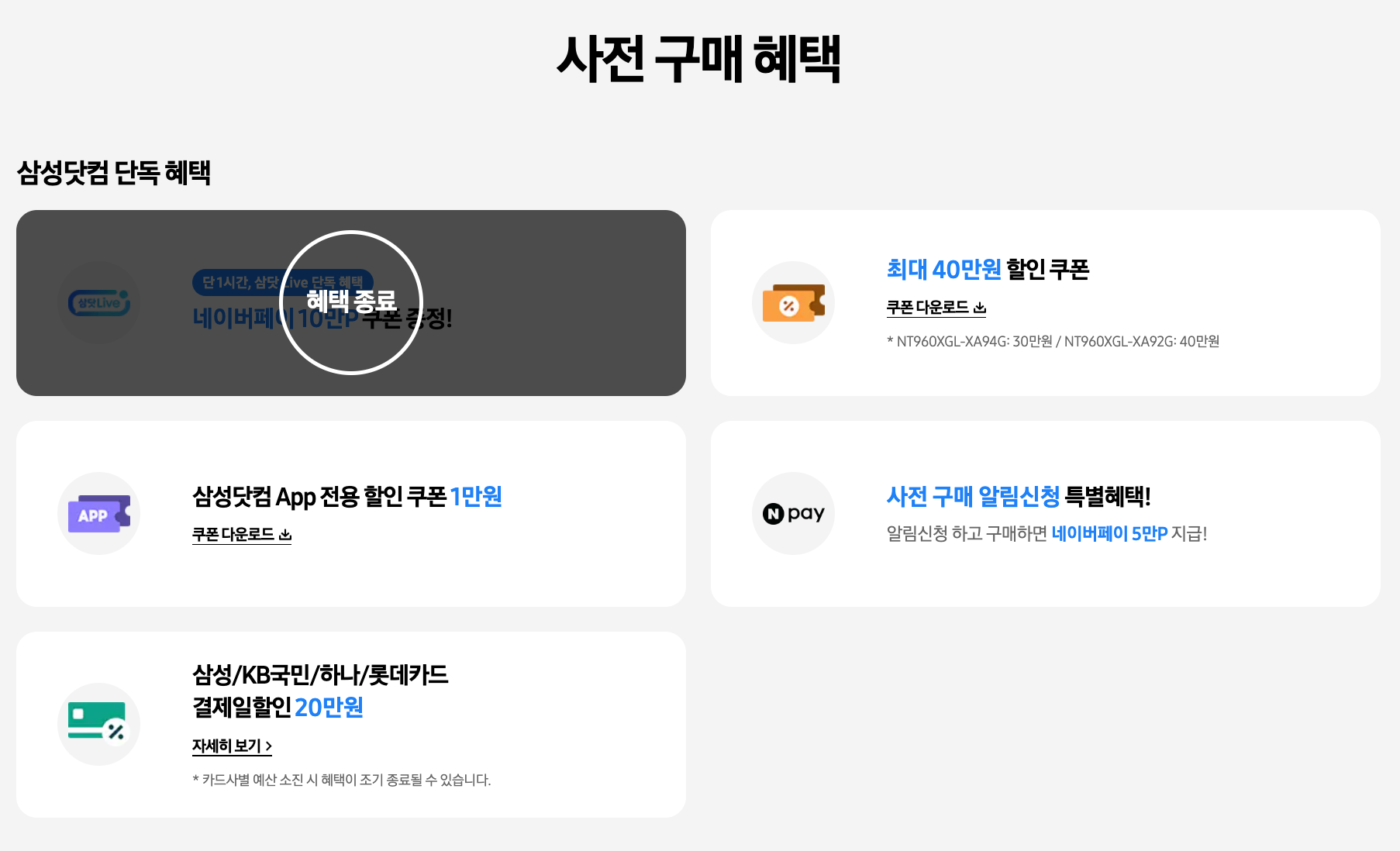 네이버페이 10만 포인트 쿠폰(현재 종료), 최대 40만 원 할인 쿠폰, 삼성닷컴 App 전용 할인쿠폰 1만 원, 사전 구매 알림 신청을 하고 구매한다면 네이버페이 5만 포인트지급, 카드사(삼성/KB국민/하나/롯데) 결제일 할인 20만 원을 받을 수 있습니다.