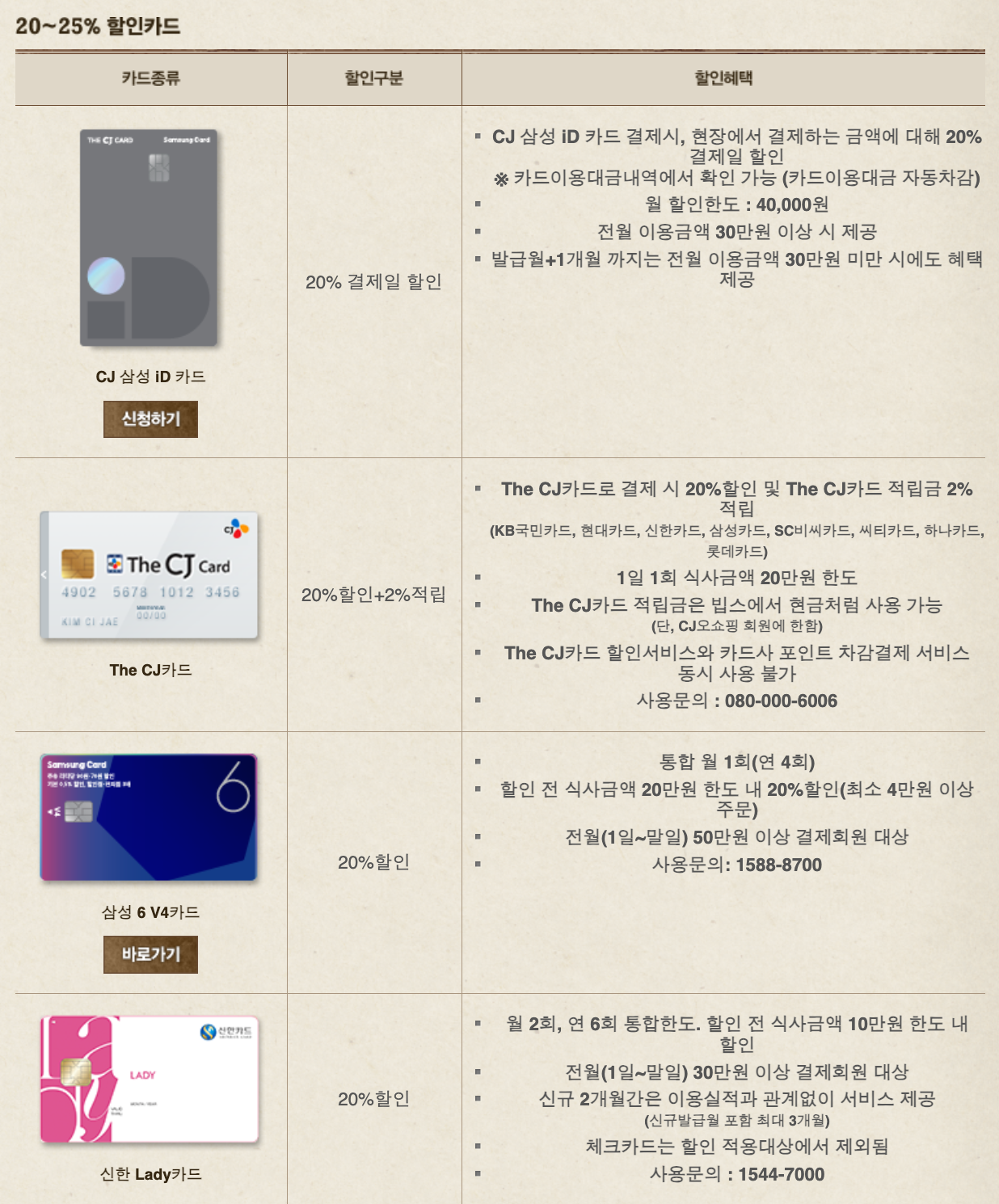 신용카드 할인은 최대 30% 할인까지 가능한데 CJ ONE 제휴카드이기 때문에 대부분은 20% 할인 적용을 받을 수 있을 것 같아요.