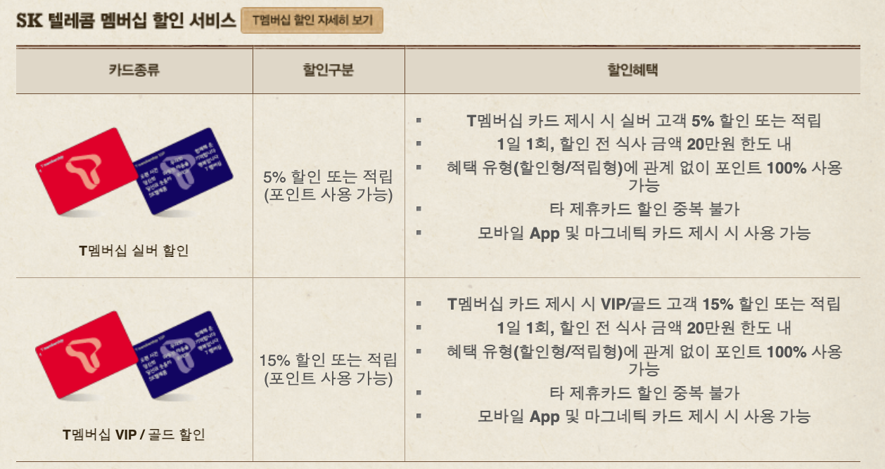 만약 본인이 생일도 아니고, 할인되는 신용카드도 없다면 통신사 카드를 사용해 보세요. 높은 등급의 멤버십이라면 최대 15%까지 할인 받을 수 있어요.