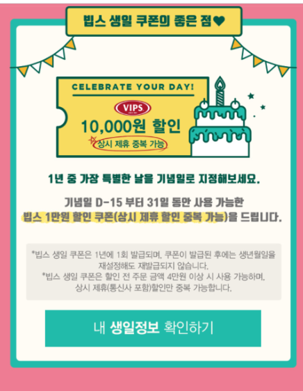 혹시 본인의 생일이 이미 지났다구요? 그러면 회원가입 시 생년월일 정보를 오늘 날짜로만 반영해 보세요. 문제 없이 생일 쿠폰을 받을 수 있습니다. VIPS 홈페이지가 아니라 CJ ONE 홈페이지 접속해야 하니 헷갈리지 마세요!
