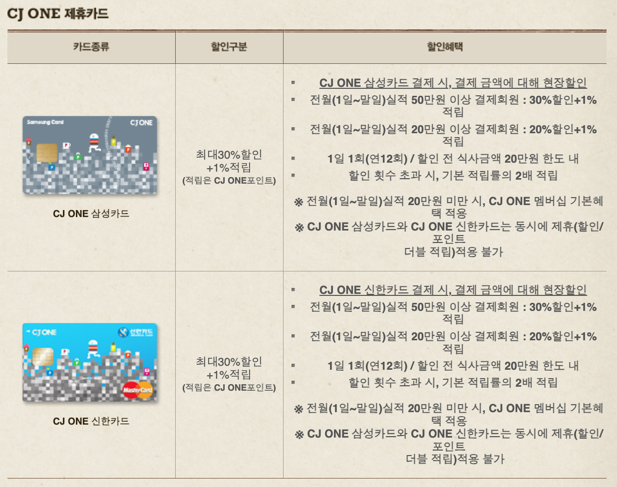 | CJ ONE 삼성카드 | 최대 30% 할인 | CJ ONE 삼성카드 결제시, 현장할인 전월 실적 50만원 이상 결제 회원에 30% |