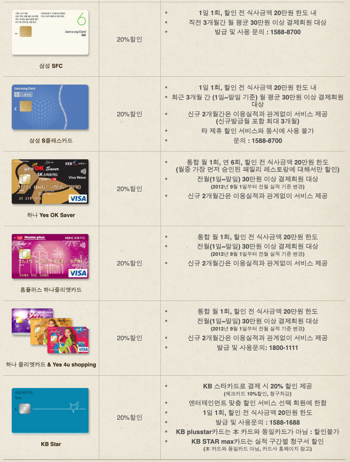 | 삼성 SFC 카드 | 20% 할인 | 1일 1회 할인 전 식사금액 20만원 한도 내 최근 3개월 간 평균 30만원 실적 |