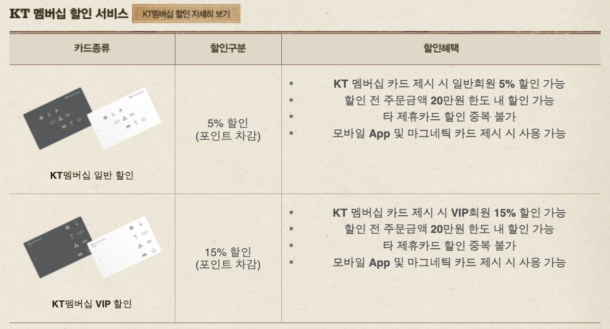 만약 본인이 생일도 아니고, 할인되는 신용카드도 없다면 통신사 카드를 사용해 보세요. 높은 등급의 멤버십이라면 최대 15%까지 할인 받을 수 있어요.