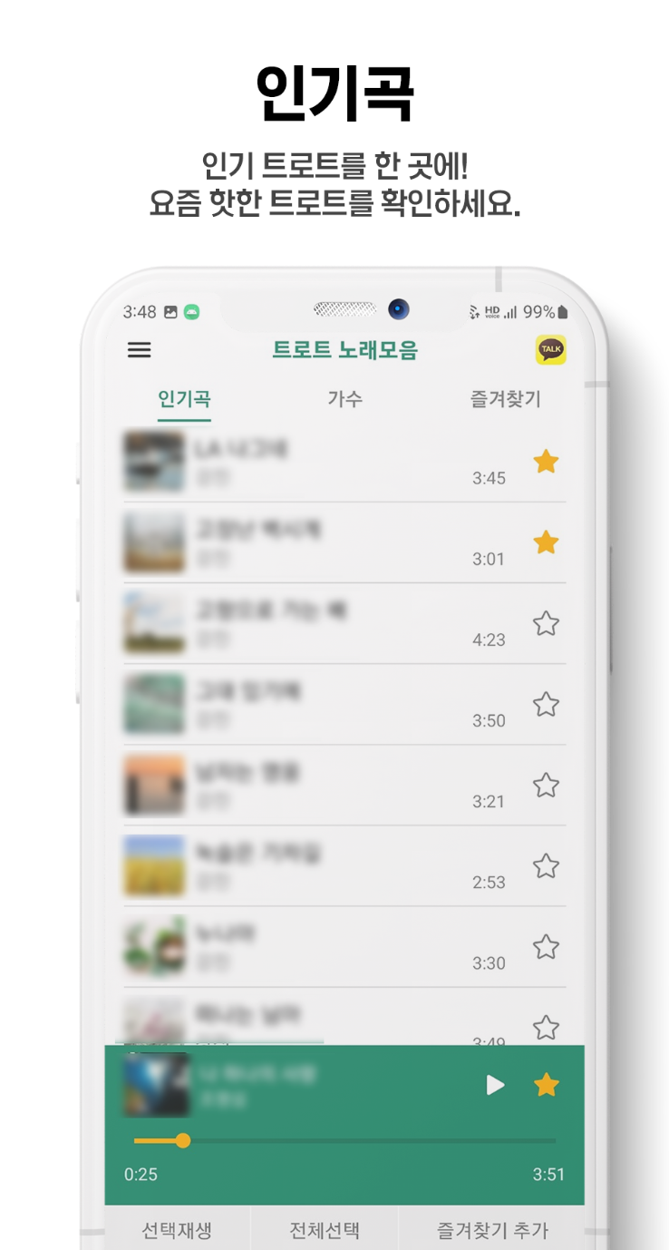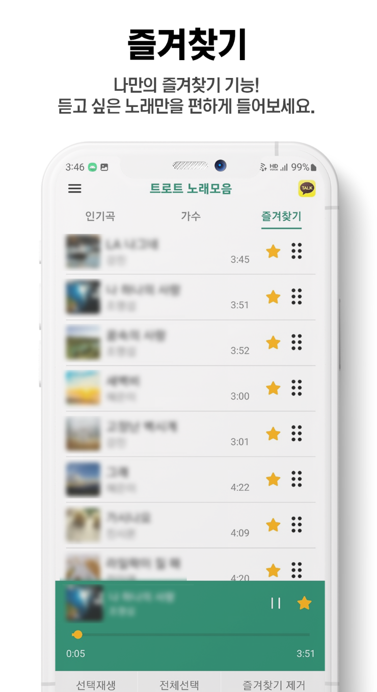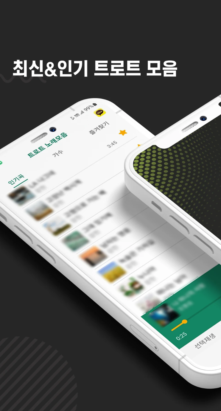 가장 최신 업데이트 날짜가 2024년 4월 14일이니 무료 어플임에도 꾸준히 관리하고 있는 것을 알 수 있습니다. 최신 인기곡과 핫한 트로트를 한눈에 보기 쉽고 즐겨 찾기 기능이 있어서 내가 듣고 싶은 노래만 선별해서 들을 수 있다는게 장점이에요.