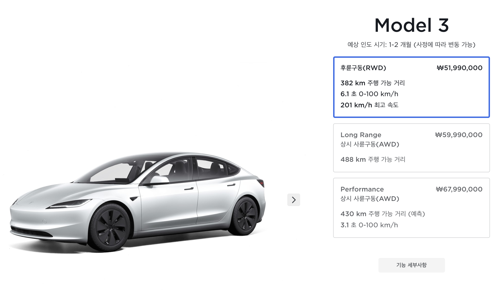 | 모델3 스탠다드 | 382km | 51,990,000원 |