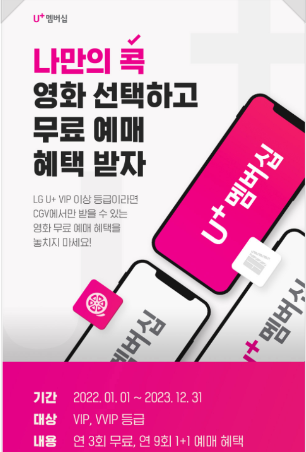 CGV 영화를 관람하기에는 LG U+ 통신사 혜택이 가장 좋습니다. VIP 등급 이상은 되어야 하지만 2년 약정 고객 대부분 최소 VIP는 될 수 있기 때문에 큰 어려움은 없는 것 같아요.