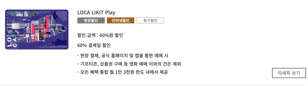 혹시 영화를 좋아하고 CGV를 선호하는데 카드가 없으시다면, 할인혜택이 큰 카드 위주로 정리해 보았는데 IBK 무직 타이거 카드와 무민 카드는 무려 10,000원 할인인데 퍼센트로 따지면 66% 할인율으로 정말 헤택이 좋은 것을 알 수 있어요. LOCA LIKITY Play 카드도 60% 혜택을 볼 수 있기 때문에 영화를 좋아하는 분들에게는 정말 꿀팁인 것 같아요.