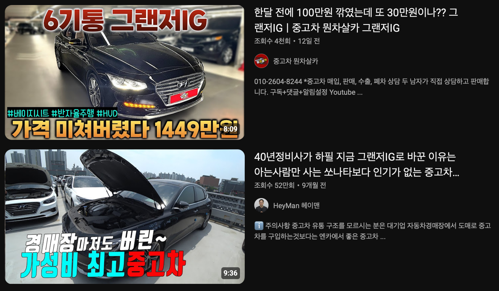 유튜버에 중고차를 검색하면 정말 다양한 유튜버들의 영상을 볼 수 있지만 하나 같이 이야기하는 최고의 가성비 차량은 그랜저입니다. 그 중에서도 2024년 현 시점에 가장 인기 있는 중고차종이 그랜저 IG 인데요.