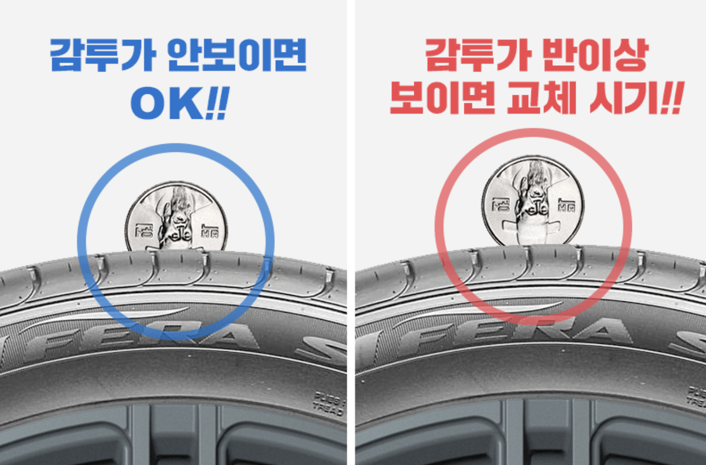 하지만 늘 자를 챙겨다니지도 않고 3mm 라는 수치도 감이 오지 않는데요. 그럴 때 쉽게 사용하는 방법이 100원짜리 동전을 활용하는 것입니다. 100원짜리 동전의 감투가 반 이상 보이면 타이어 교체시기라고 할 수 있습니다.