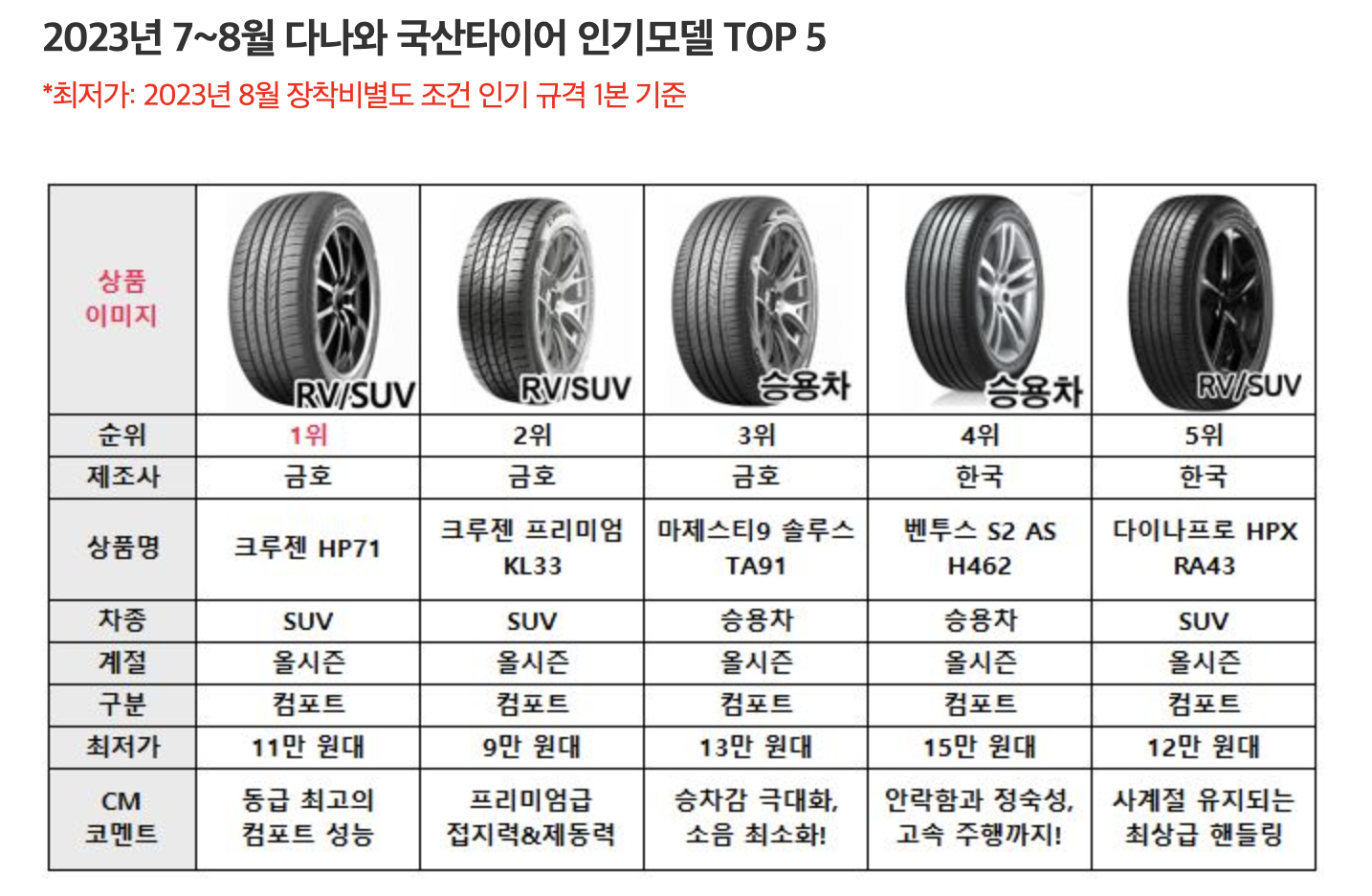 타이어 판매순위 Top 5