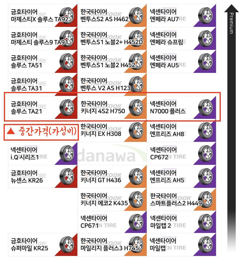 그 다음 사진은 타이어 계급도 인데요. 중간계급(금호타이어 솔루스 TA21 , 한국타이어 키너지, 넥센타이어 N7000)이 가성비가 괜찮고 중간가격대이므로 그 윗등급의 타이어가 프리미엄 타이어로 간주하면 됩니다.
