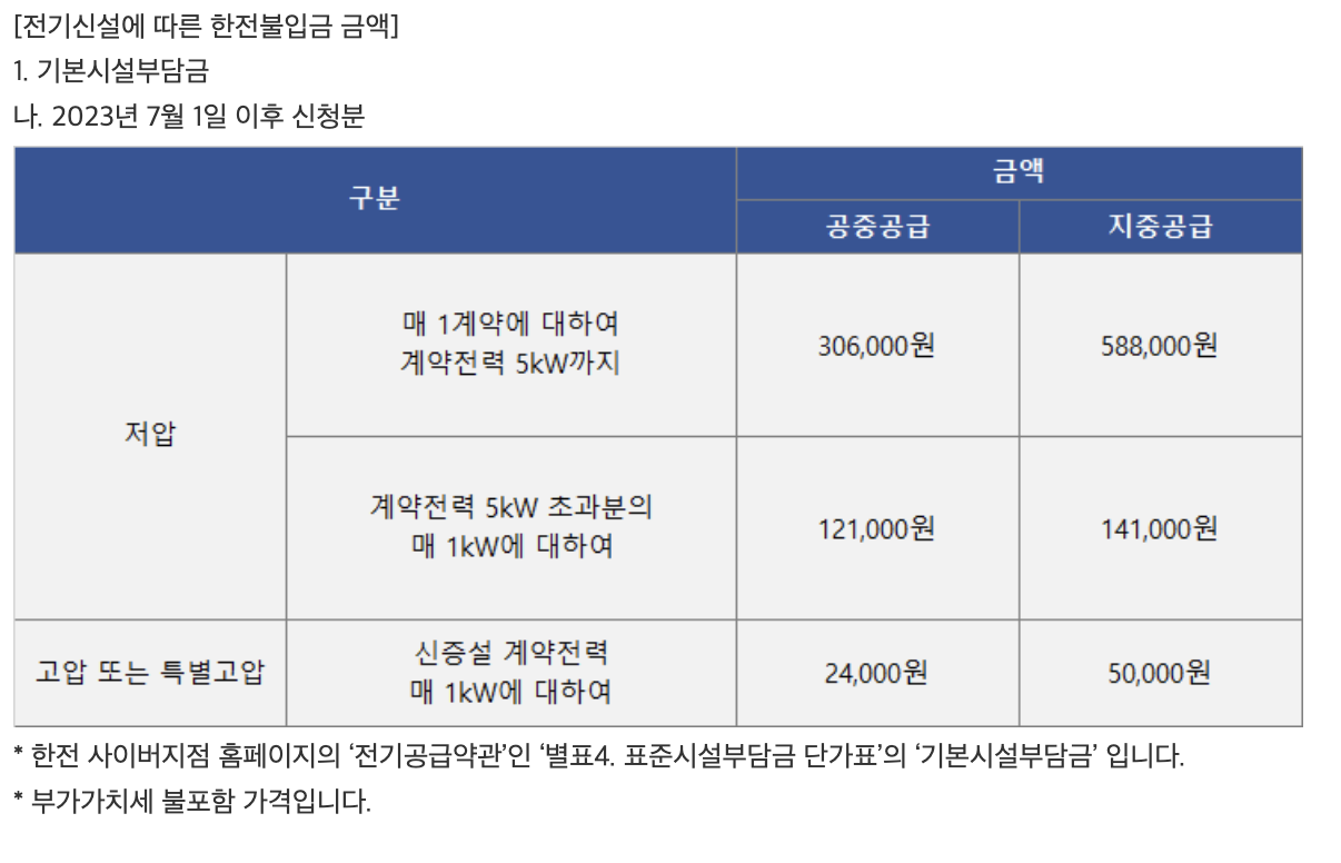부담금 종류에 따라 기본시설 부담금과 거리시설부담금으로 나뉘는데 대략 55만원정도 발생한다고 생각하면 됩니다. 본인이 거주하고 있는 환경에 따라 금액은 달라질 수 있으니 한전 전화번호 123에 문의주시거나 아래 링크의 약관 참고하시기 바랍니다.