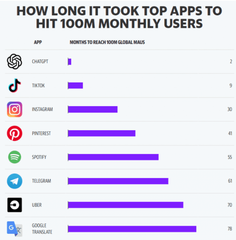 이러한 AI 기술은 2022년 챗 GPT가 세상에 공개되면서부터 본격적인 관심을 받게 된 것 같아요. 그 인기가 얼마나 대단했냐면 월간 활성 사용자 수 1억 명을 돌파하기까지 단 2개월이 걸렸다고 합니다. 같은 지표를 달성하기 위해서 틱톡은 9개월, 인스타그램은 30개월이 걸렸는데 챗 GPT는 단 2개월이라니 정말 대단한 인기입니다.