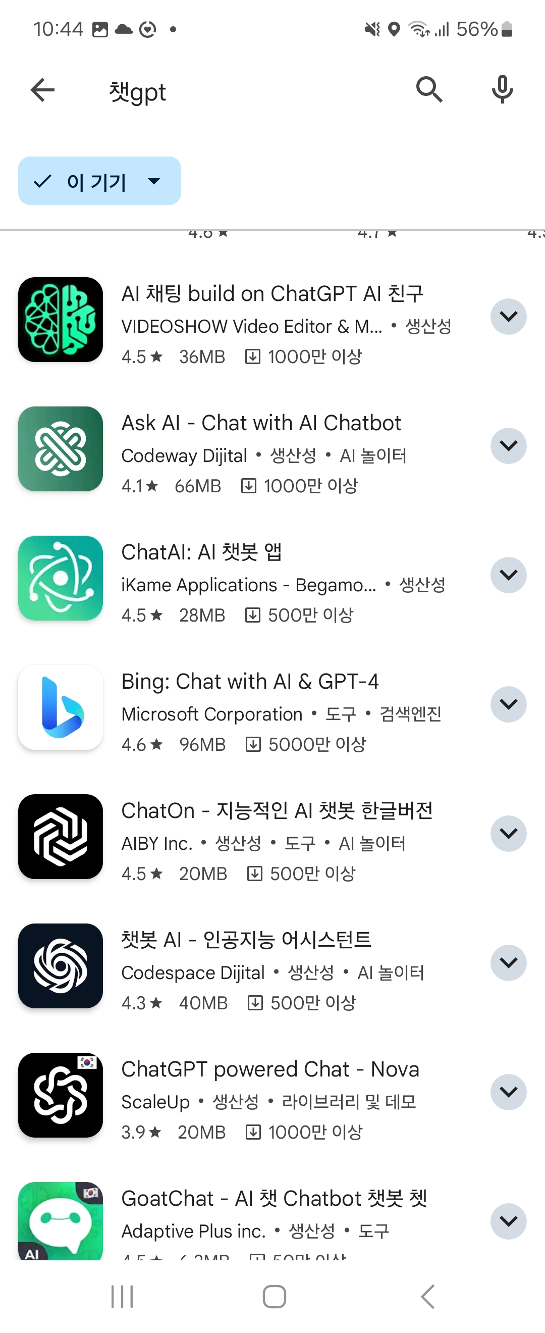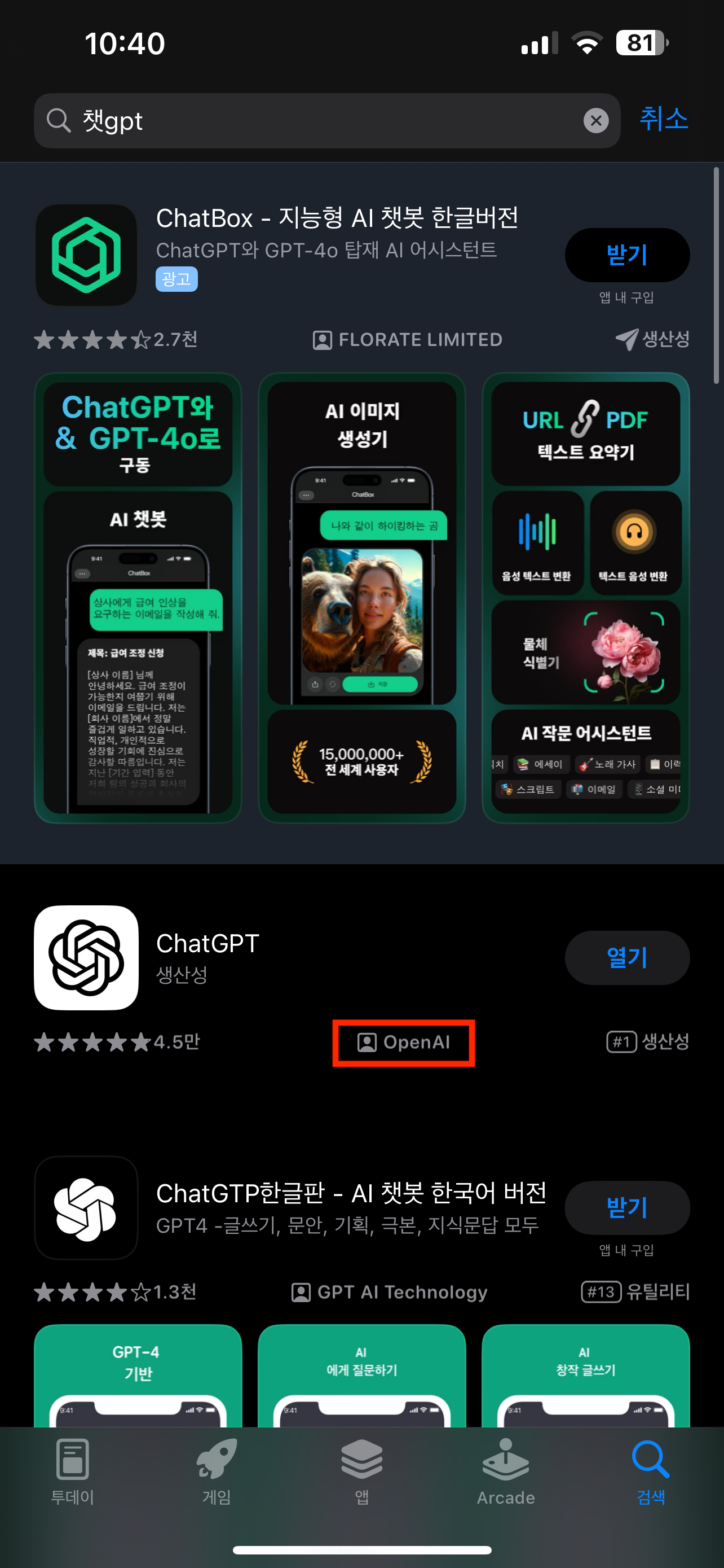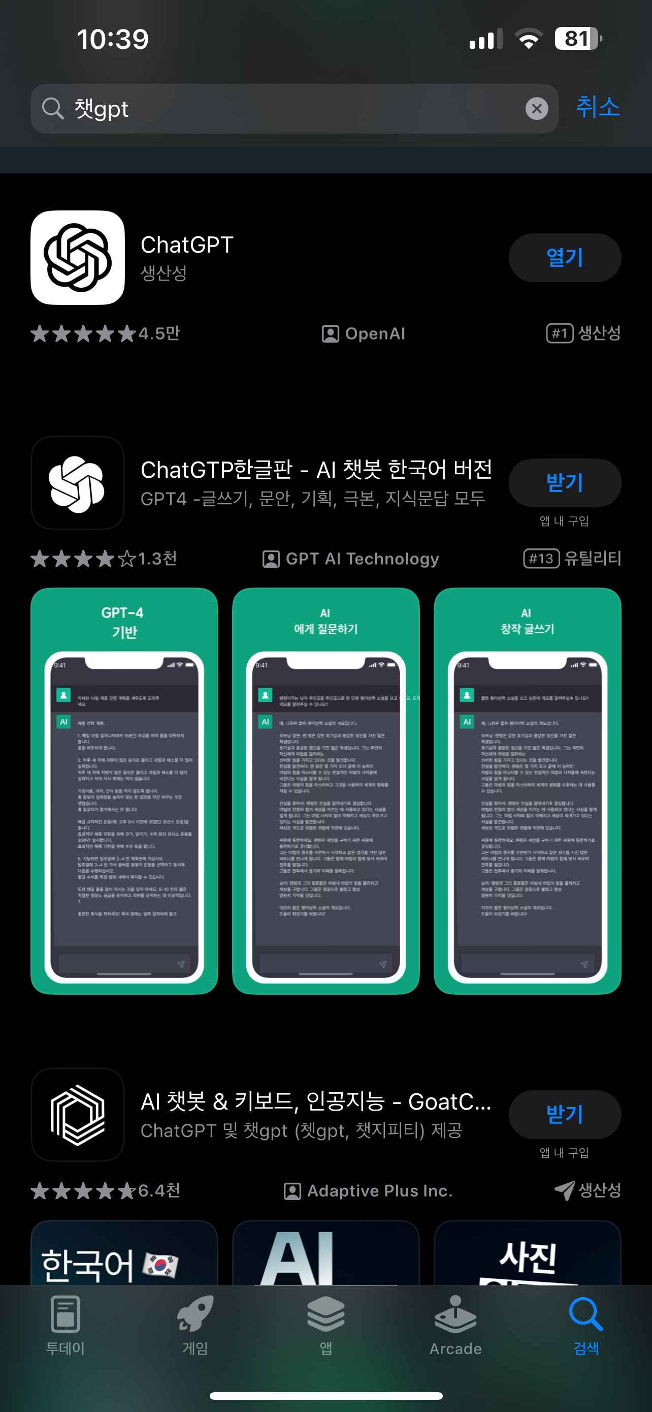 순서대로 아래로 내려보면 ChatGPT 한글판, AI 챗봇 & 키보드, 인공지능 이라는 유사앱이 뜨는데 로고도 매우 유사해서 평소에 관심이 없거나 잘 모르는 분들이라면 충분히 헷갈릴 수 있을 것 같아요.