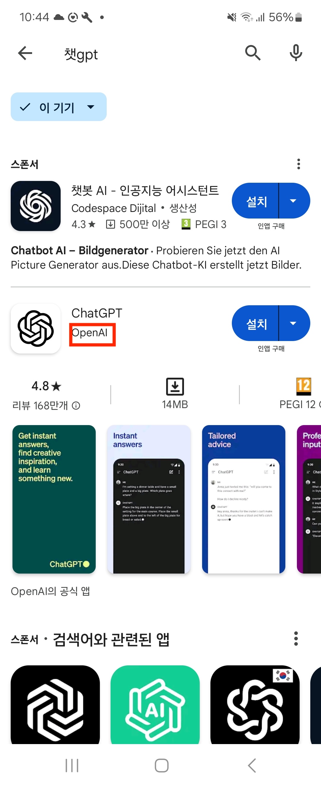 이번에는 안드로이드 Play 스토어에서 검색해보았습니다. 앱스토어와 마찬가지로 최상단에는 스폰서(광고)를 받아 챗봇 AI라는 앱이 노출이 되네요.