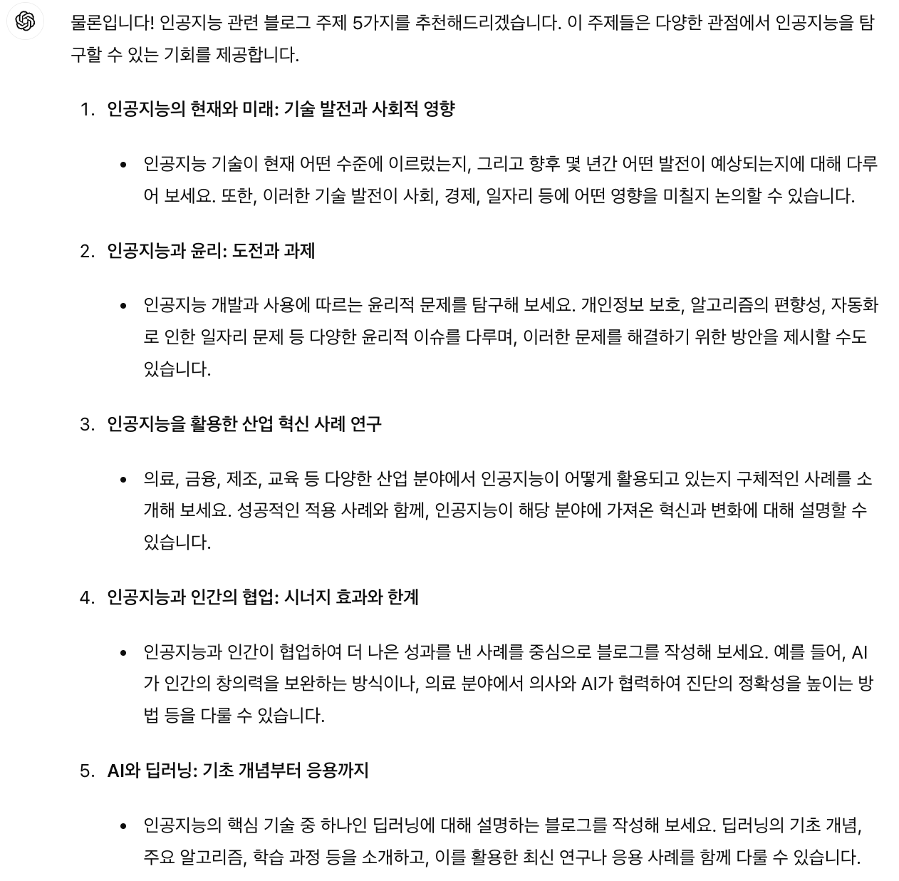 저는 블로그를 작성하기 때문에 인공지능과 관련된 블로그 주제를 물어보겠습니다. 그러면 정말 빠른 속도로 5가지를 추천해주는데 솔직히 제가 블로그로 쓰고 싶은 주제는 없지만 아이디어가 떠오르지 않거나, 참고할만한 내용을 찾을 때는 충분히 괜찮은 정도인 것 같아요.