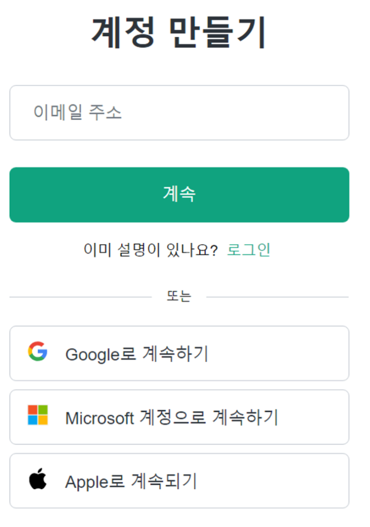 회원가입을 누르면 구글, 마이크로 소프트, 애플 계정으로 연동을 할 수 있는데 1분 내외로 가입가능하니 번거롭더라도 꼭 가입절차는 정상적으로 하는 것이 좋습니다.