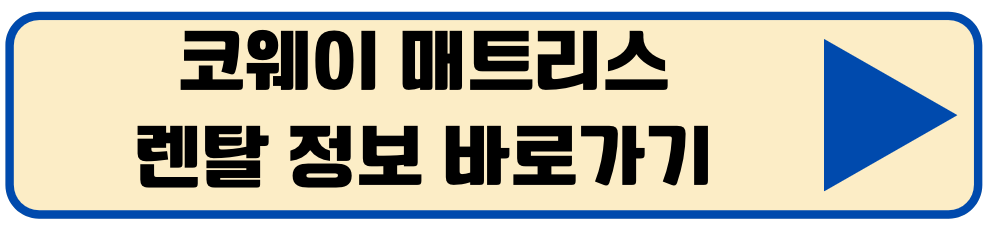 그런데 정수기로 유명한 코웨이에서는 침대 메트리스도 렌탈 형식으로 판매하고 있어 가격 부담은 확 낮추고 매트리스 관리까지 해주니 다른 유명 브랜드만큼이나 경쟁력이 있어 보였습니다. 그리고 코웨이 페스타 할인기간에는 최대 12개월 렌탈료 반값으로 렌탈할 수 있으니 관심 있는 분들은 공식 홈페이지 꼭 한 번쯤 들어가서 가격 비교를 해보셨으면 좋겠어요.