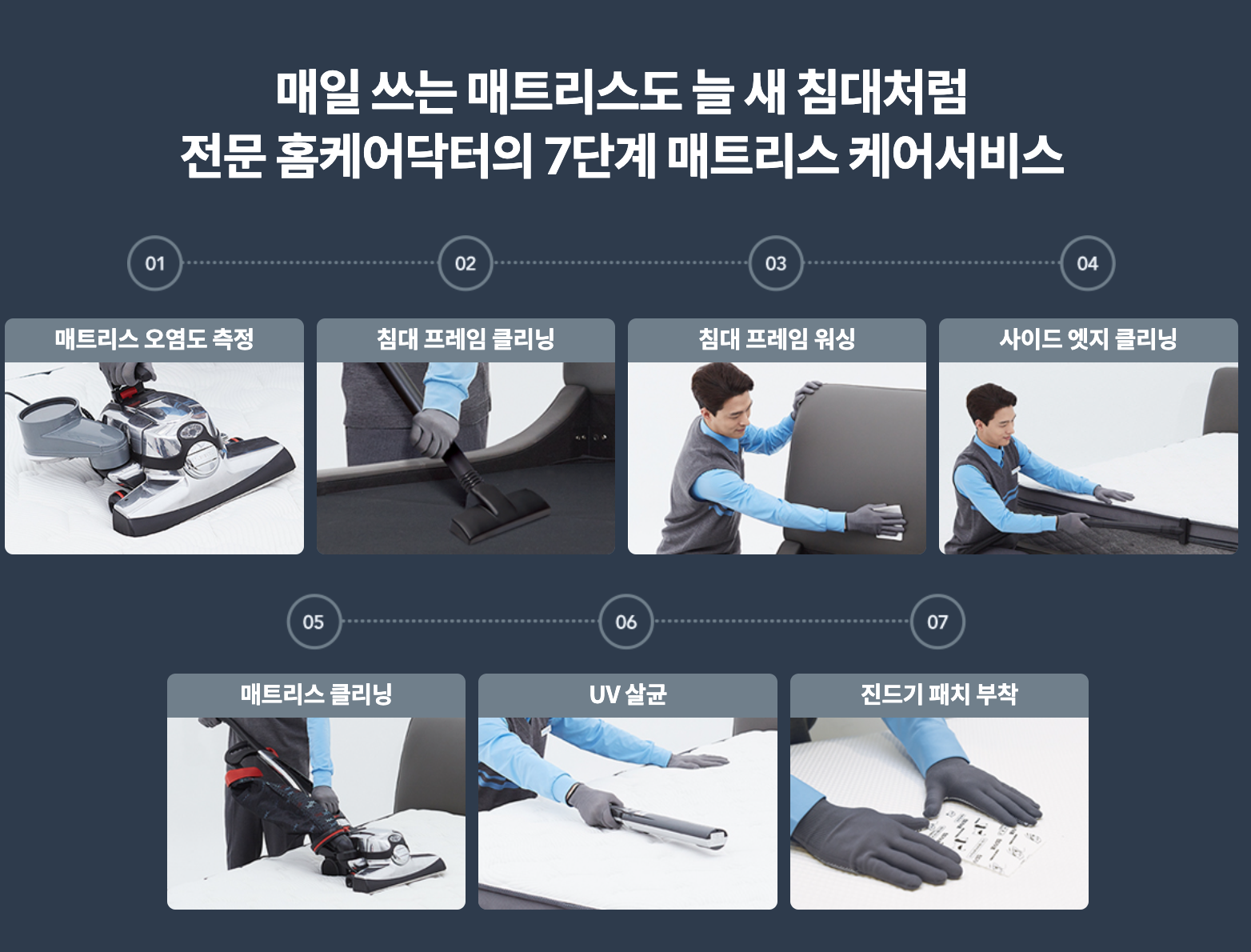 그런데 코웨이 매트리스를 구매 혹은 렌탈을 하면 매트리스 케어서비스를 받을 수 있습니다. 무려 7단계에 걸친 케어서비스인데, 매트리스 오염도를 측정하고 클리닝 한 뒤 여러 가지 살균과정을 거쳐 마지막으로 진드기 패치까지 부착해 줍니다.
