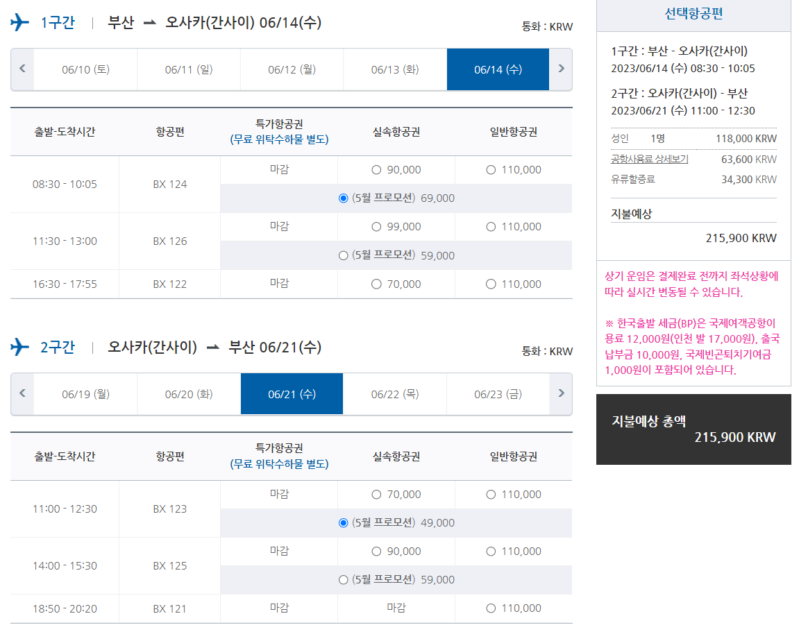 간단한 예로 부산(6/14일 출발)에서 오사카(6/21일 도착)로 비행기 표를 검색해 보겠습니다. 기본적으로 같은 목적지라도 특가항공권, 실속항공권, 일반항공권으로 다른 가격을 제시합니다. 특가 항공권은 위탁 수하물이 기본 옵션에서 제외되어 있는데 본인 짐이 많지 않을 경우 당연히 특가 항공권이 유리합니다. 위의 캡처 화면에서 보면 알 수 있듯이 이미 특가 항공권은 마감 상태입니다. 여기서 미리 예매하는 것이 중요하다는 것을 알 수 있습니다. 그리고 5월 프로모션 가격이 별도로 있는데 같은 실속 항공권이라도 가격이 4만 원 차이가 발생합니다. 당연히 특가 항공권, 프로모션 항공권부터 물량이 소진되므로 빨리 선점하는 것이 이득입니다.