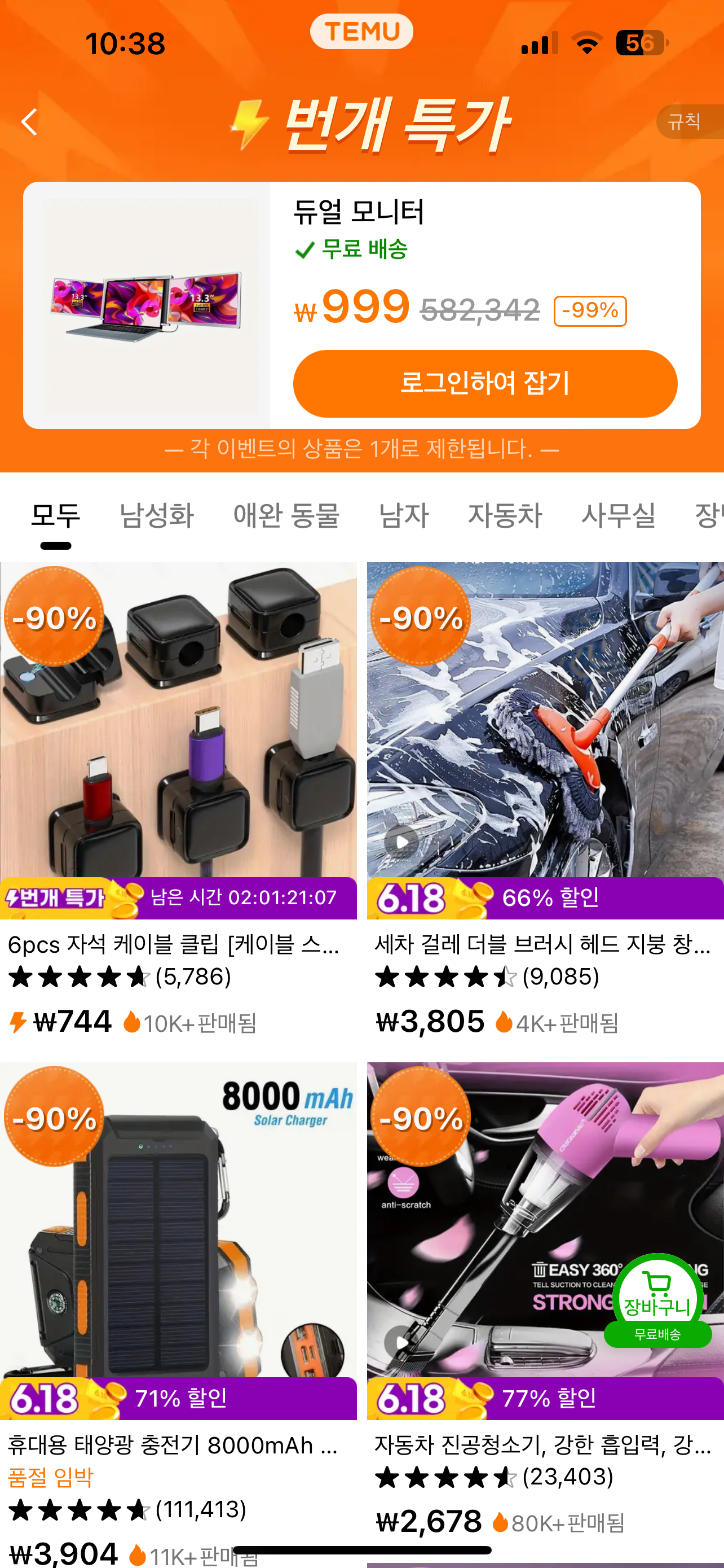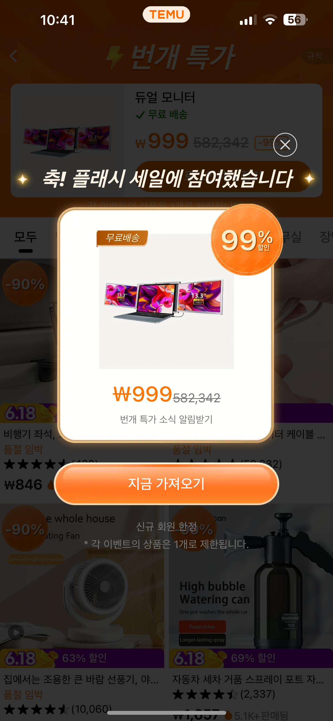 닌텐도 스위치 뿐만 아니라 테무에서는 여러가지 상품을 초특가에 세일하는데, 검색어에 flashsale이라고 검색하면 해당 제품을 찾을 수가 있습니다. 오늘 날짜 번개특가 상품은 55만원 상당의 듀얼모니터를 999원에 팔고 있는데 마찬가지로 이벤트 상품이기 때문에 구매할 수는 없었습니다.