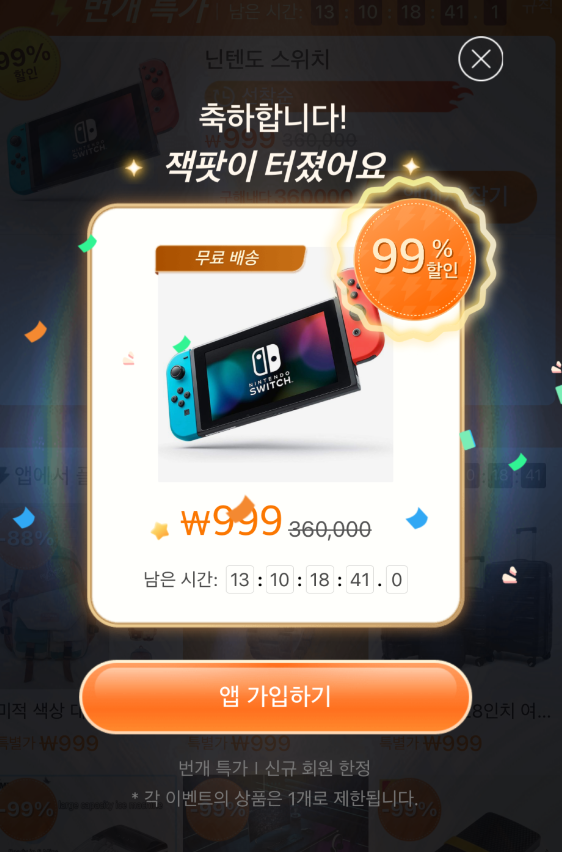 앞서 말씀드렸듯이 테무에서 999원에 구매할 수 있는 닌텐도 스위치는 정품은 맞지만 누구나 다 구매할 수 있는 제품은 아니라 이벤트 상품으로 지금 바로 구매할 수는 없습니다. 테무 닌텐도 스위치 링크를 통해 들어가면 99% 할인을 받을 수 있는 것처럼 팝업창이 생기는데요.