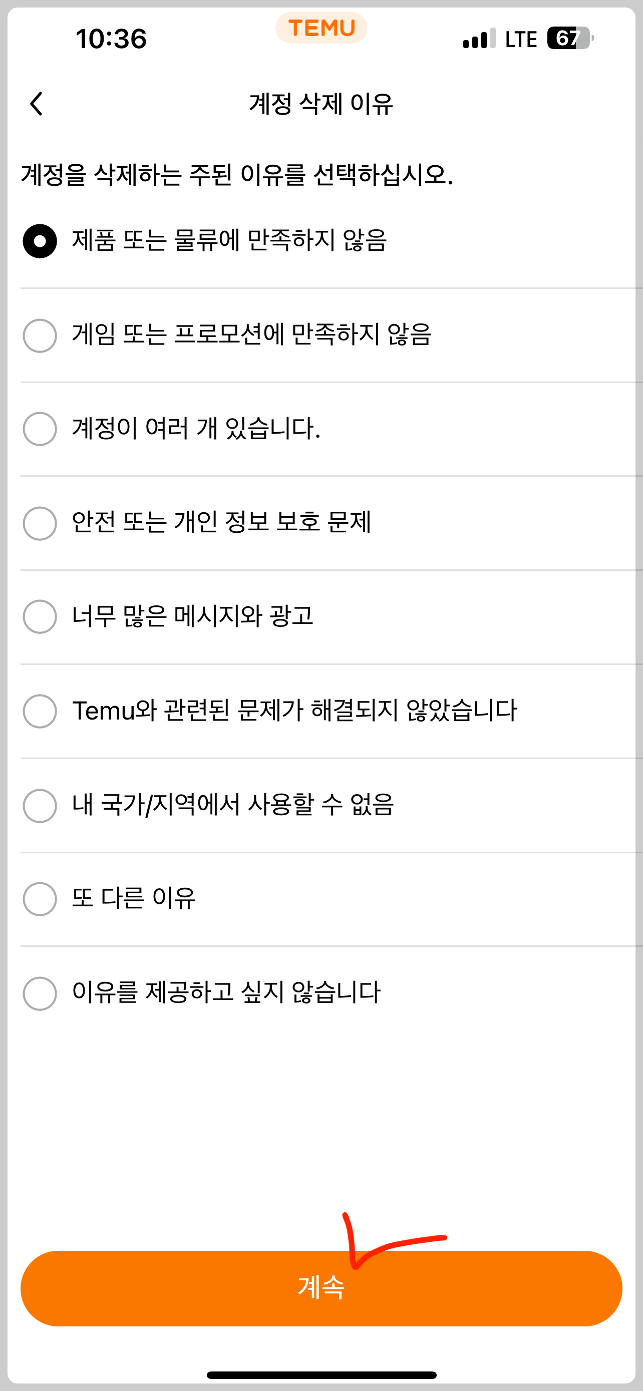 5. Temu 계정을 영구히 삭제하고 싶습니다 선택 후 계속 버튼을 눌러줍니다.