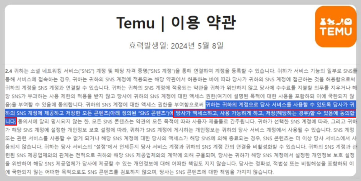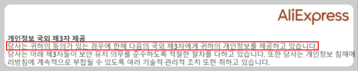 유사한 사례로 한창 가입자가 늘어나고 있는 알리 익스프레스와 테무는 개인정보를 국외 제3자에 제공해도 괜찮다는 이용 약관을 가입 조건에 집어 넣어놓았기 때문에 개인 정보 유출에 대한 불안감을 더욱 키우게 만들고 있습니다.
