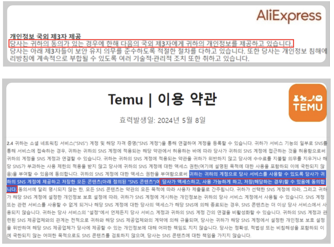 그럼 틱톡라이트는 정말 개인정보를 유출하고 있을까요? 그냥 중국에서 만들어진 앱이기 때문에 단순히 개인정보 유출을 걱정하는 것일까요? 우리가 틱톡라이트뿐만 아니라 알리나 , 테무와 같은 중국에서 만들어진 사이트에 회원가입을 하게 되면 가입 약관에 아래와 같은 문구를 볼 수 있습니다.
