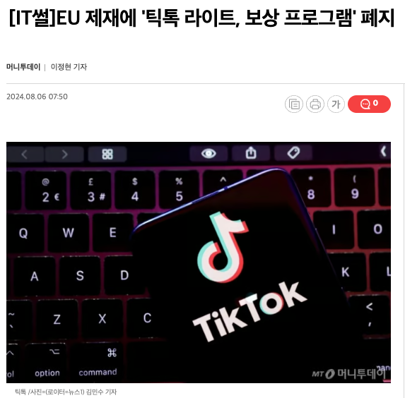 최근 EU(유럽연합)은 틱톡 라이트가 어린아이들의 SNS 중독을 유발시킨다는 명목으로 여러 가지 제재를 하기 시작했고 틱톡은 보상 프로그램을 해지하는 것으로 결론을 내렸습니다. 틱톡뿐만 아니라 숏폼을 보다 보면 시간 가는 줄 모르고 짧고 자극적인 영상을 찾아 시간을 정말 많이 쏟게 되는데 개인적으로는 현금성 이벤트 참여하시고 빠르게 탈퇴하는 것을 추천드려요.