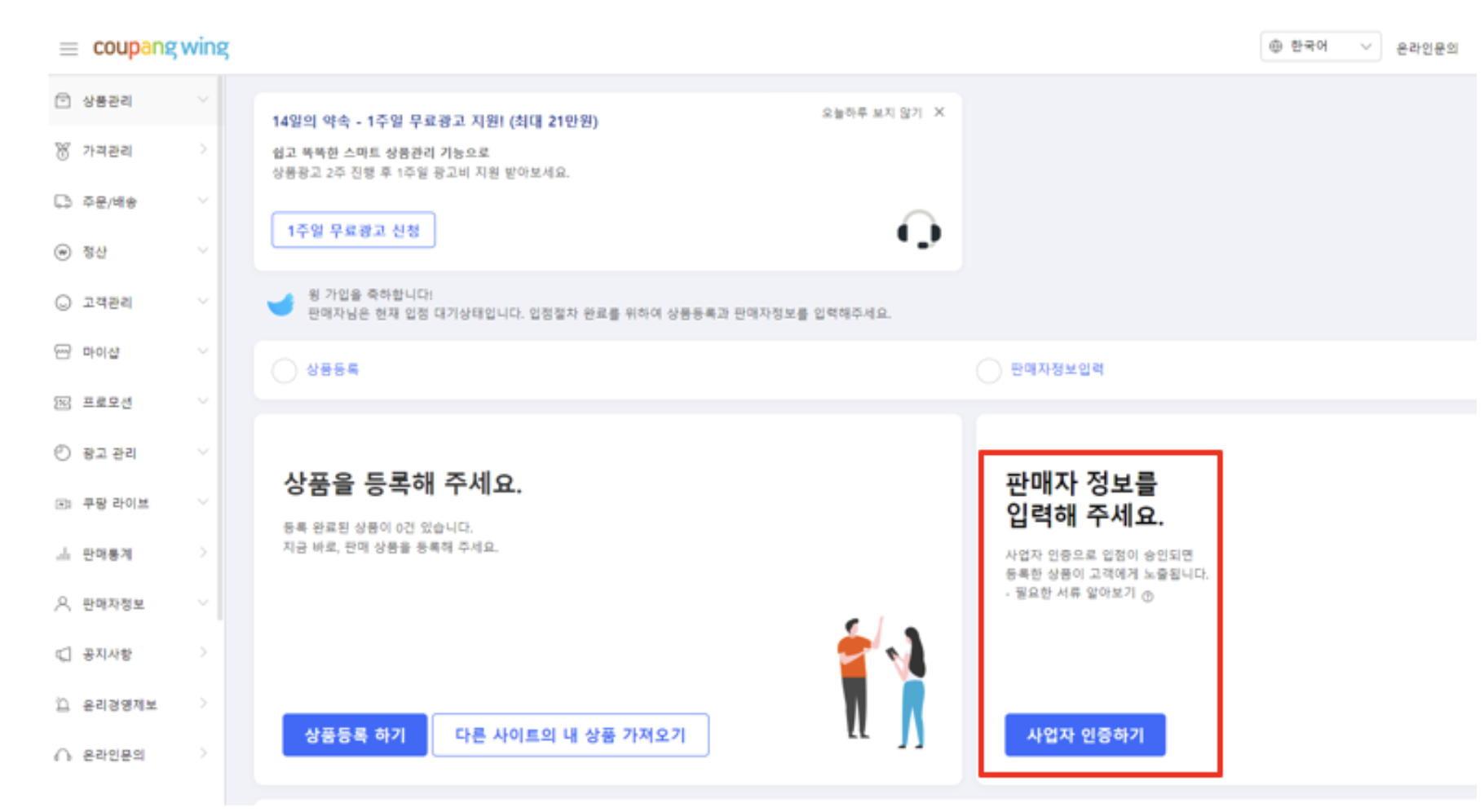 쿠팡 윙 사업자 인증하기