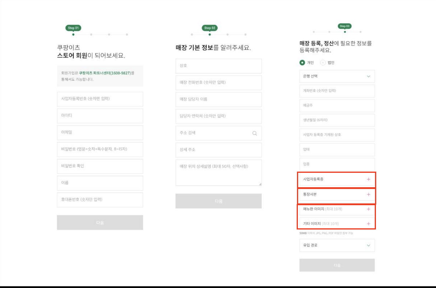 가게를 운영하고 계신분들이라면 당연히 가지고 있을 서류라고 생각하므로 이것에 대한 별도의 설명은 하지 않도록 하겠습니다. 추가로 가입할 때 메뉴판 이미지 및 기타 이미지를 첨부할 수 있고, 각각 최대 10개의 이미지까지 등록이 가능하니 가입하시기 전에 미리 준비하시면 훨씬 빨리 회원 가입이 가능합니다.