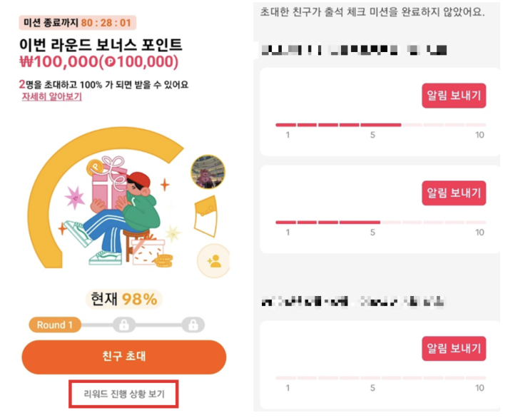 정말 쉬우면서 어려운 것이 바로 10일간 출석체크입니다. 초대 받은 모든 친구들이 10일간 출석 체크를 해주어야 리워드를 받을 수 있습니다. 누구하나 하루라도 출석을 누락하게 된다면 바로 미션실패로 보상금을 받기가 어려워요.