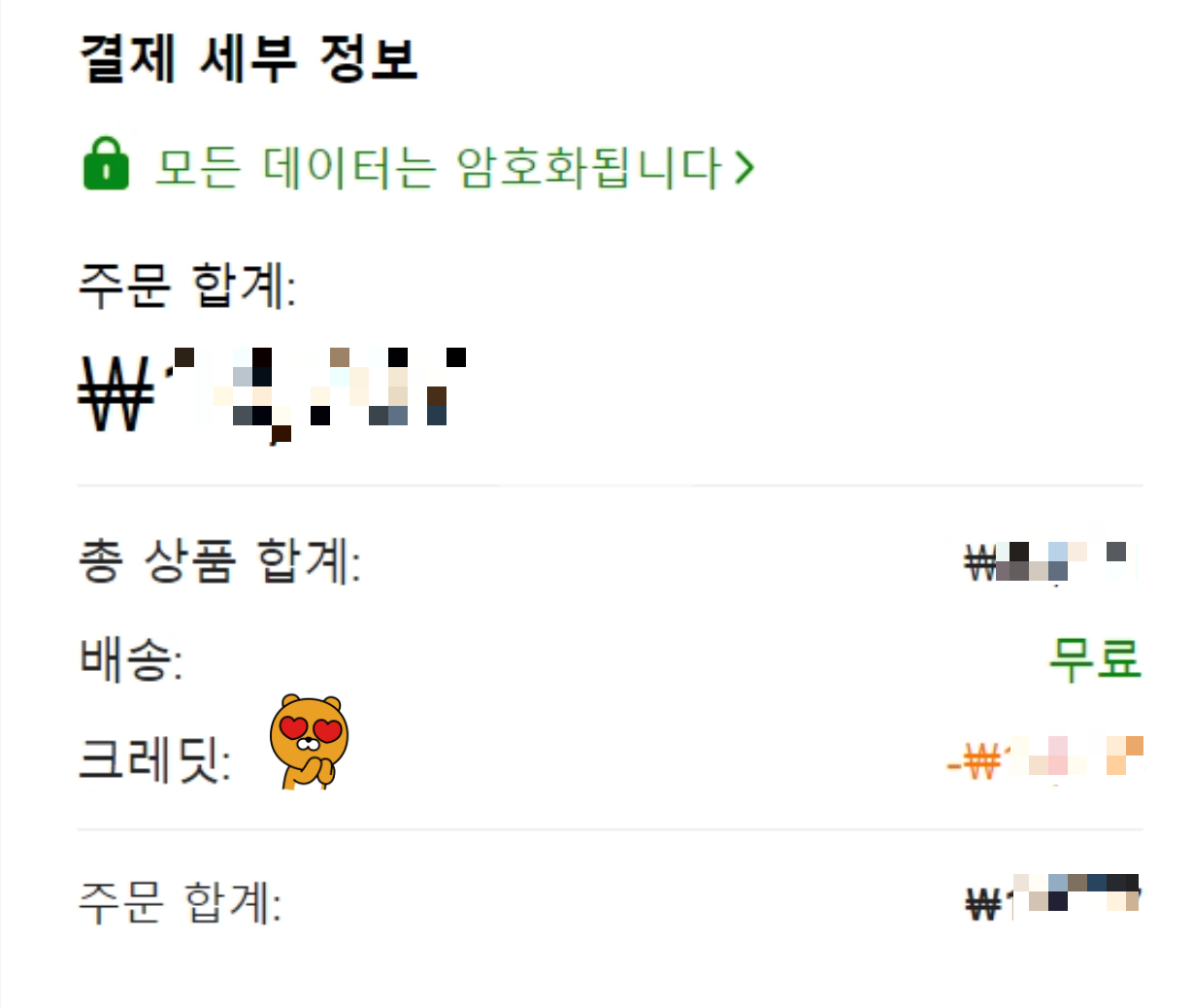크레딧은 주문 최종 결제창에서 자동적으로 차감되어 사용자가 별도로 지정할 필요가 없습니다. 결제 금액에서 우선순위로 차감되므로 아주 손쉽게 사용할 수 있고 쌓이는 즉시 사용하여 보통은 크레딧이 아니라 할인으로 착각하는 경우도 많을 것 같아요.