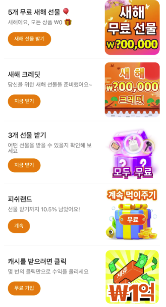 테무는 물건을 구매하지 않더라도 무료 사은품을 받을 수 있는데요. 처음에는 반신반의 했지만 이미 블로그를 찾아보면 많은 분들이 무료 사은품을 받은 후기들을 찾아볼 수 있고, 저 역시 이벤트 참여를 했었는데 [마이페이지]-[크레딧 및 무료선물 받기]를 선택해서 들어가게 되면 5개 선물 받기, 팜랜드, 피쉬랜드 등 이벤트를 고를 수 있게 됩니다.