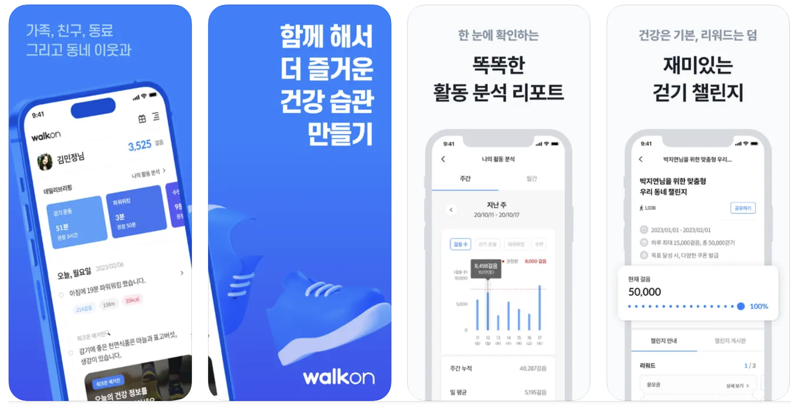 워크온은 개인뿐만 아니라 커뮤니티와 함께 목표를 설정하고 걷기를 실천할 수 있는 앱입니다. 학교, 직장, 지역 커뮤니티에서 함께 걸음 목