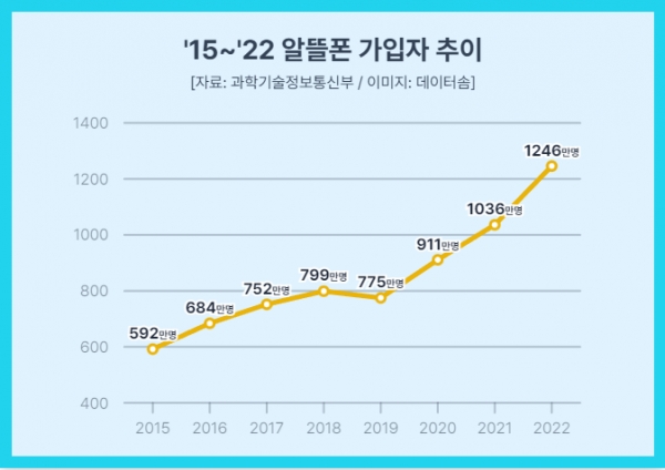 여러분은 현재 어떤 통신사를 사용하고 있나요? 통신요금이 갈수록 비싸지면서 알뜰폰에 대한 관심이 급증하고 있습니다. 알뜰폰 통신사는 저렴한 요금제를 위해 광고비를 최소화하는데도 입소문을 타고 가입자 수가 꾸준히 증가하고 있습니다. 위의 그래프를 보게 되면 2019년부터는 그래프가 가파르게 상승하고 2022년 기준 1246만 명이 이용하고 있음을 알 수 있습니다. 제 주위에도 젊은 층을 위주로 자금제 휴대폰을 구매한 뒤 알뜰폰을 조합하여 스마트폰을 사용하는 사람이 많습니다. 최근에는 알뜰폰 통신비마저도 아끼기 위해 프로모션 기간에 맞추어 번호이동을 하는 소비자 층도 생겼다고 합니다.