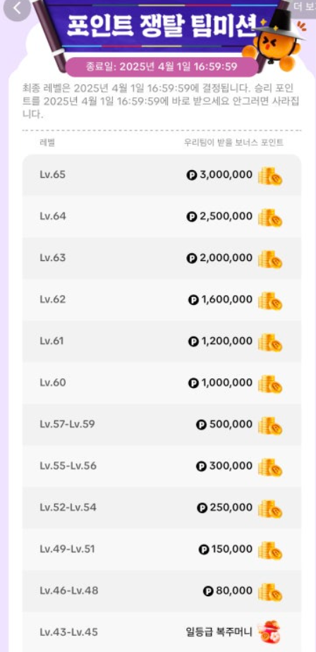 북치기 대항전에 참여를 할수록 레벨업을 해야되는데 레벨1 ~ 레벨6 범위 내에서는 보너스 포인트를 받을 수 없습니다. 최고 레벨인 65가 되면 최대 3백만 포인트를 받을 수 있는데 한 사람에게 몰아서 주는 것이 아니라 팀원에게 분배해 주기 때문에 무조건 북은 많이 쳐야 된다는 것을 기억하셔야 합니다.