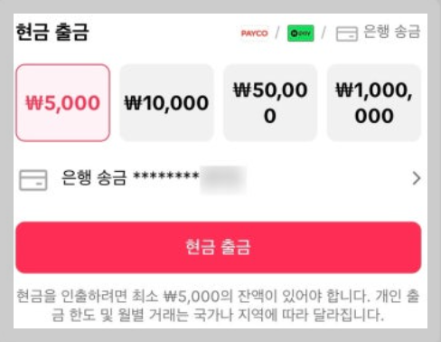 - 최소 출금 금액을 충족했는지 확인해보세요. 최소 출금 요청금액은 5,000원이며 그 이하는 출금이 불가합니다.