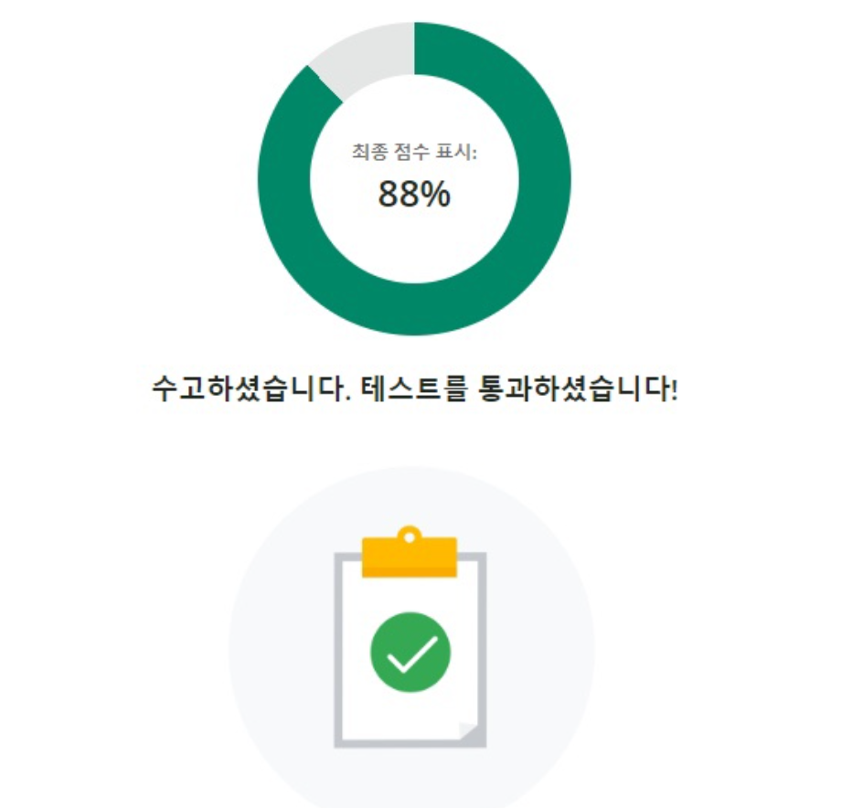 우선 시험을 치르고 느낀 점은 충분히 누구나 딸 수 있는 자격증이다! 라는 것입니다. 구글 공식 강의와 예상문제 연습을 푼다면 누구든지 1주일 정도만 공부하면 합격할 수 있을 것 같았어요. 그리고 시험 비용이 무료에다 떨어지면 24시간 이후에 재도전을 할 수 있기 때문에 부담 없이 시험을 칠 수 있다는 것도 정말 큰 장점으로 느껴졌습니다.