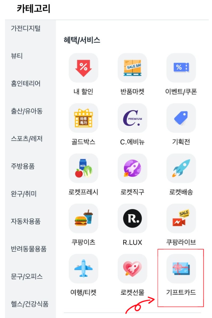 1. 쿠팡 모바일앱에 접속하고 "카테고리 - 혜택/서비스 - 기프트카드" 순서로 선택해 줍니다. PC에서는 기프트카드를 선택할 수 없고 오로지 모바일 앱에서만 가능하니 참고하세요.