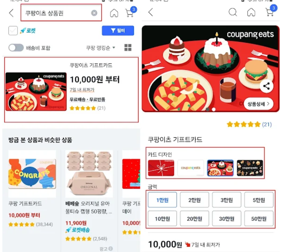 쿠팡이츠 기프트 카드도 마찬가지로 구매하면 되는데 쿠팡 모바일 앱에 접속하여 쿠팡이츠 상품권을 검색하고, 쿠팡이츠 카드 디자인과 그액을 고르고 선택을 하면 손쉽게 구매할 수 있어요.
