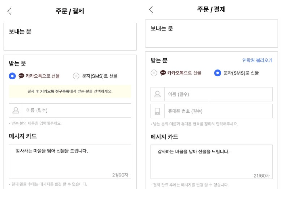 3. 주문/결제 단계에서는 기프트 카드 전송방법 (카카오톡 혹은 문자)을 선택하고 메세지 카드를 작성하면 됩니다. 메세지 카드는 최대 60자 까지 작성이 가능하니 마음을 담아 메세지를 써보세요.