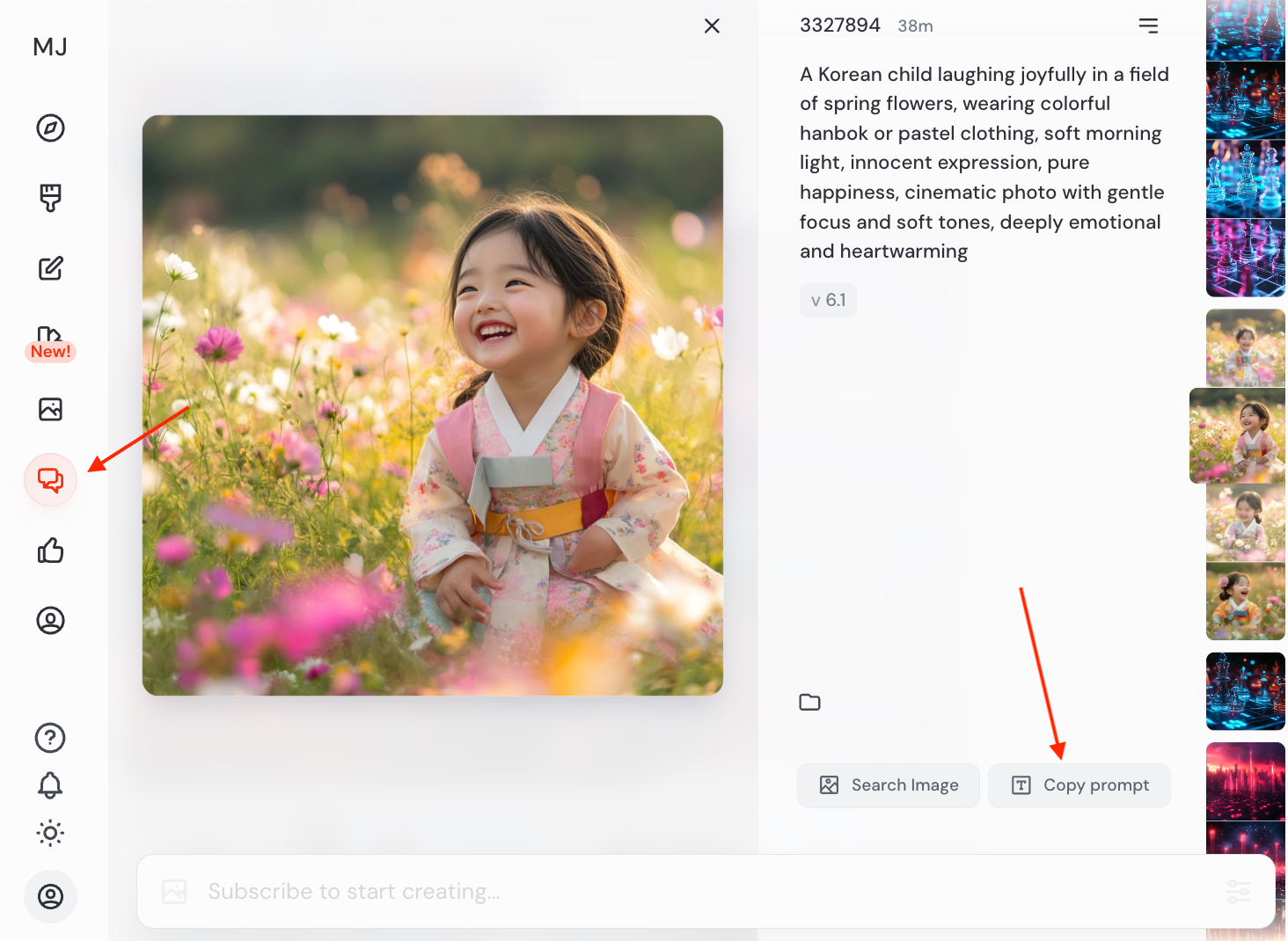 이런식으로 작성해주면 되고 본인이 원하는 스타일의 사진을 찾고싶다면 미드저니의 채팅방에 들어가서 Copy Prompt 후 원하는 방식대로 바꾸어 봅시다.