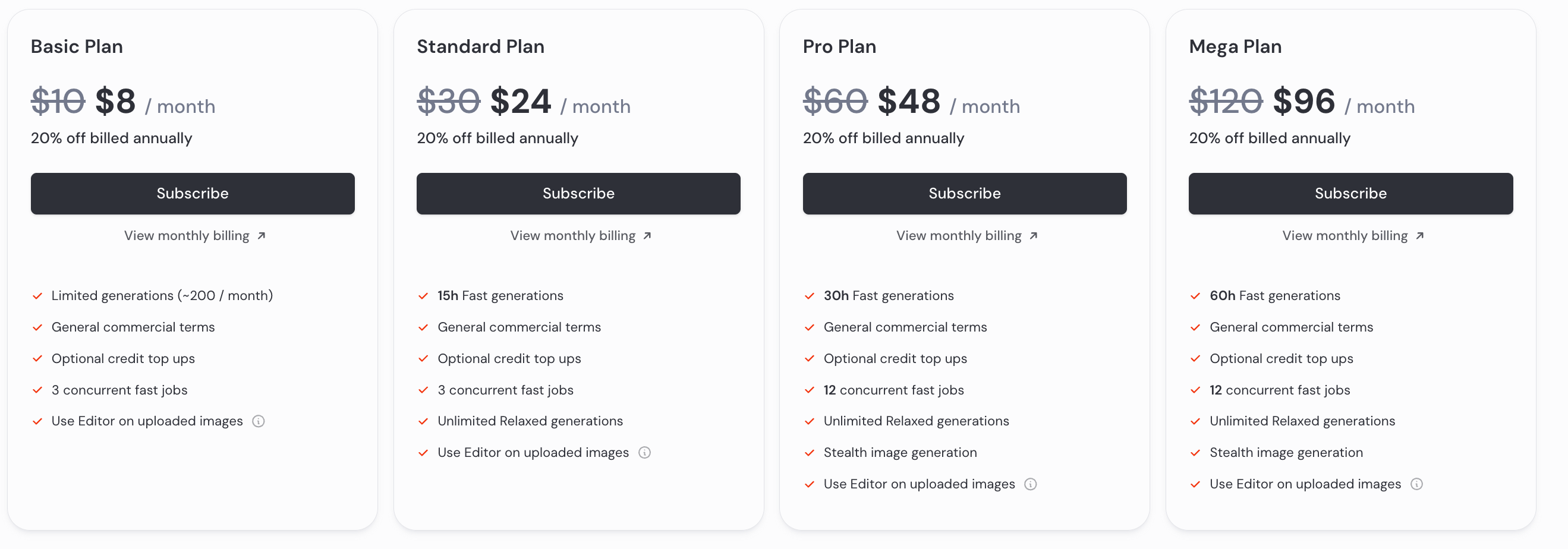 | Standard Plan | $30 | 이미지 무제한 생성, 빠른 속도 지원 |